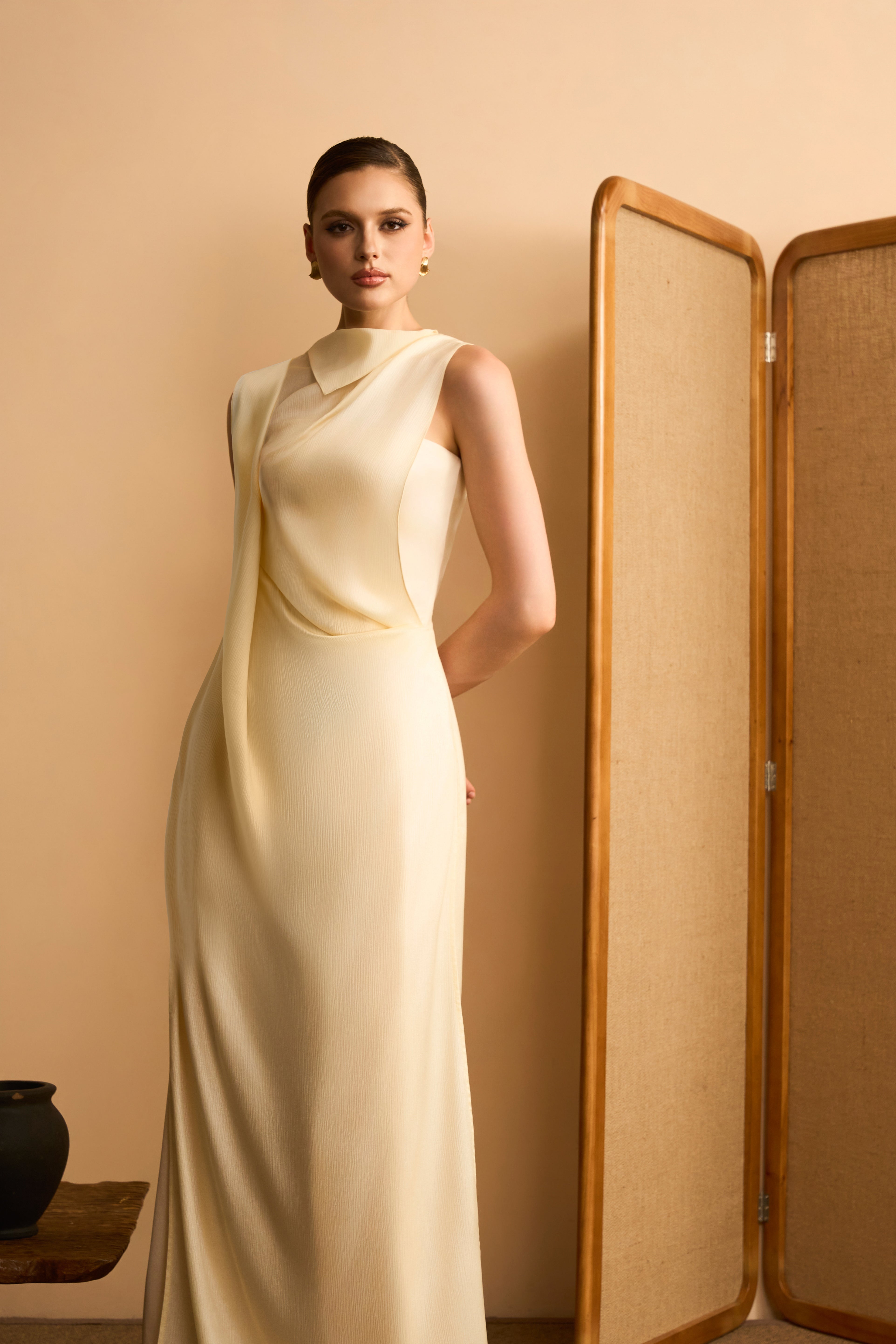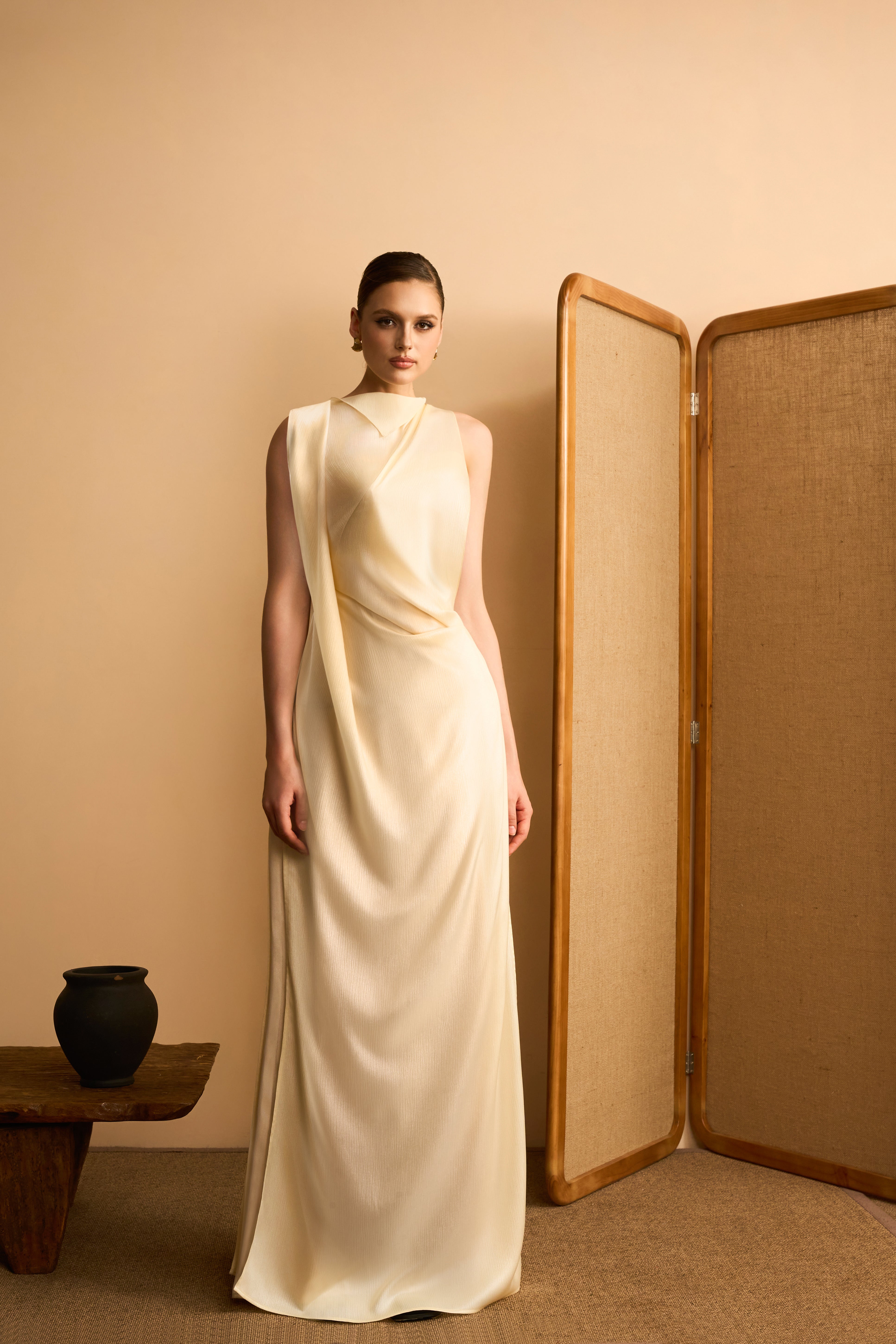Ha Mien Sheath Asymmetric Drape Shimmering Twill Maxi Dress