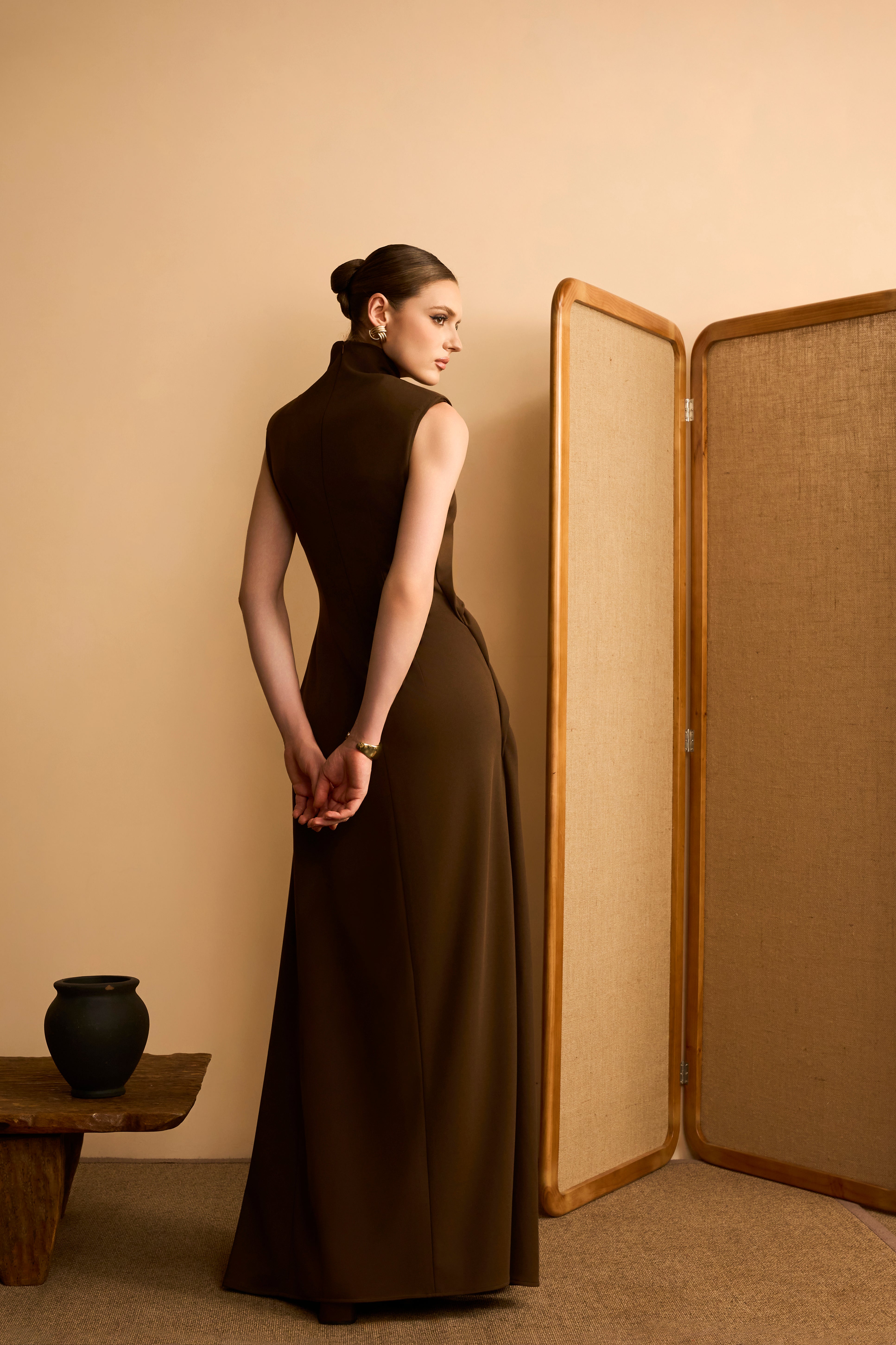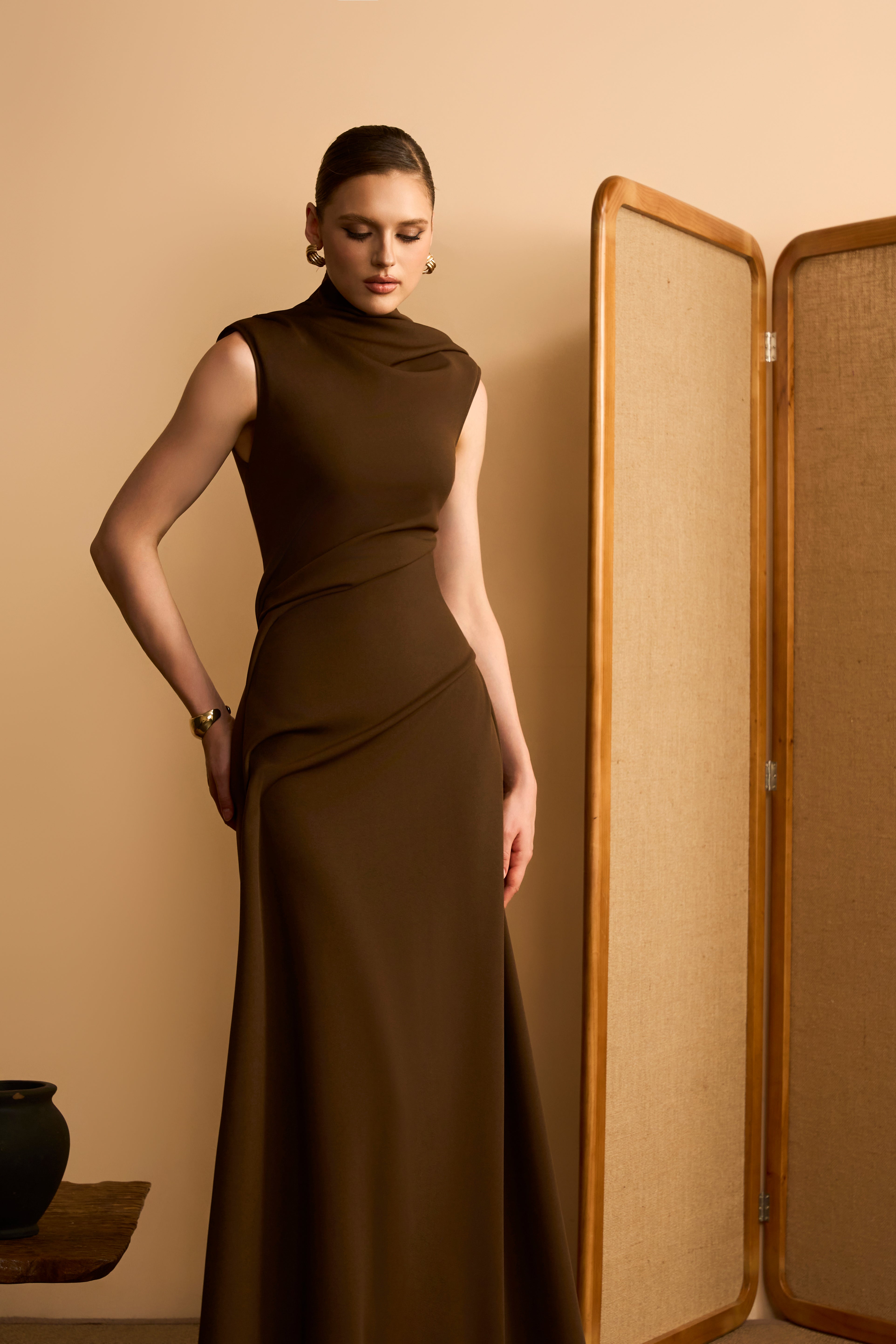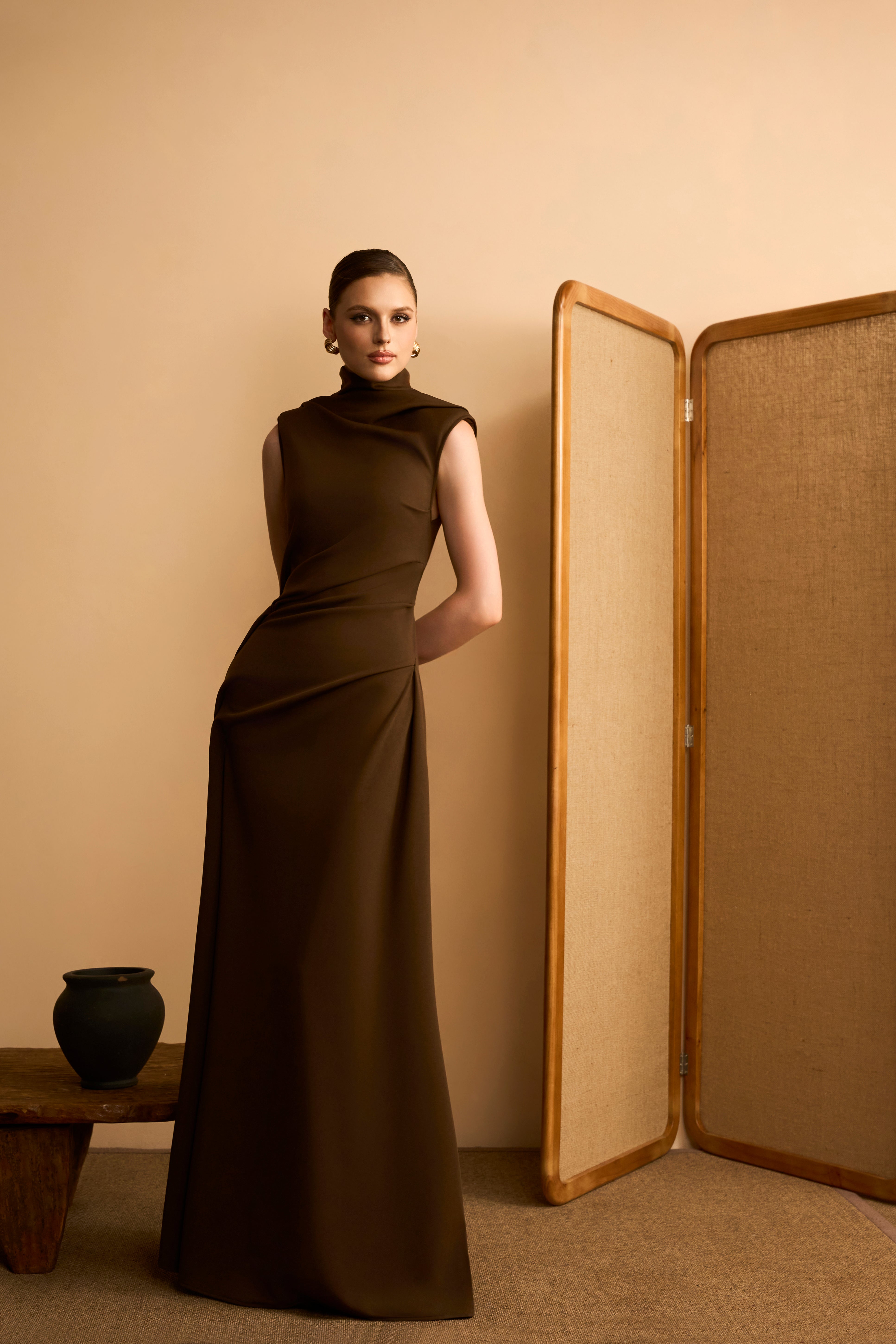 Thu Mien Sheath High-Neck Ponte Knit Maxi Dress